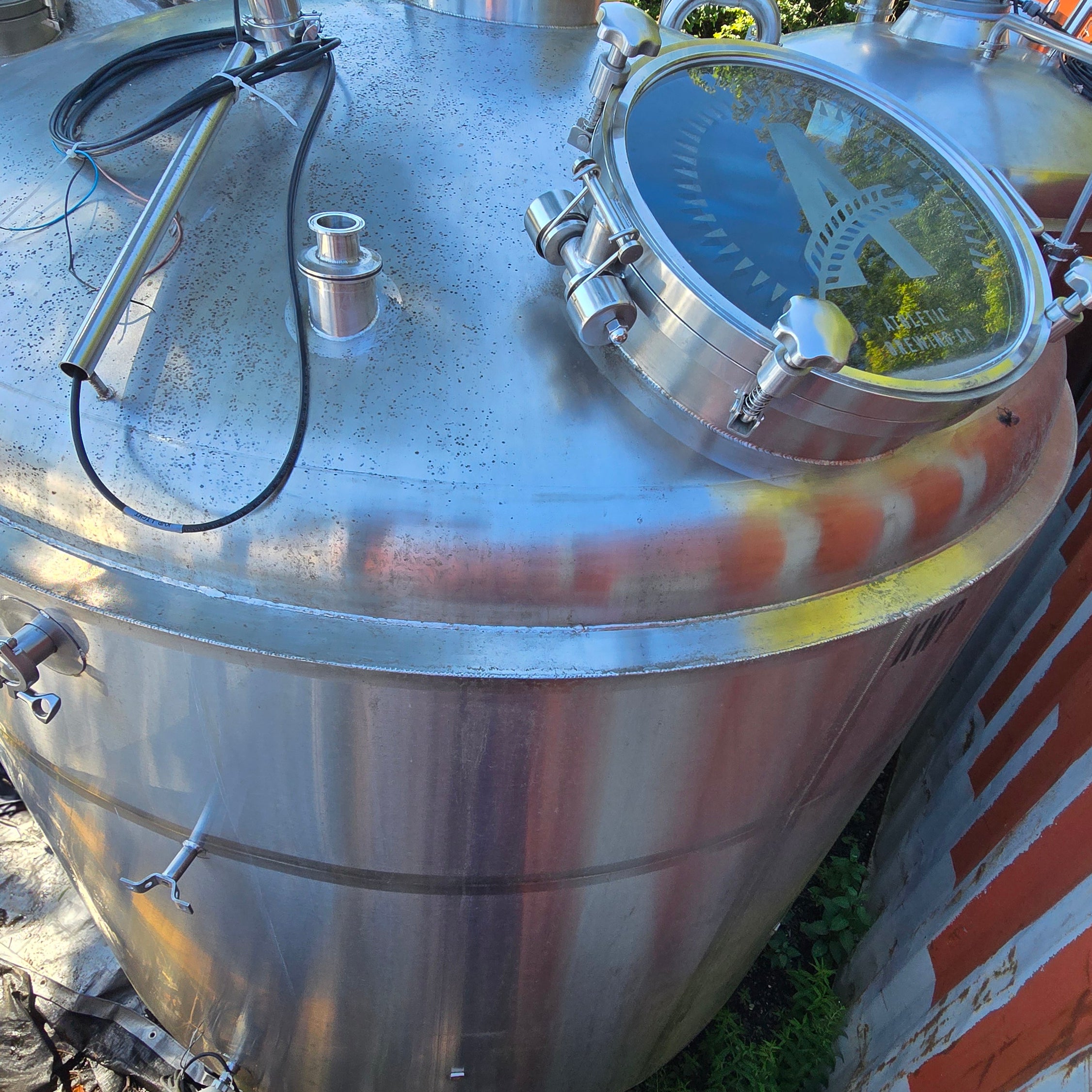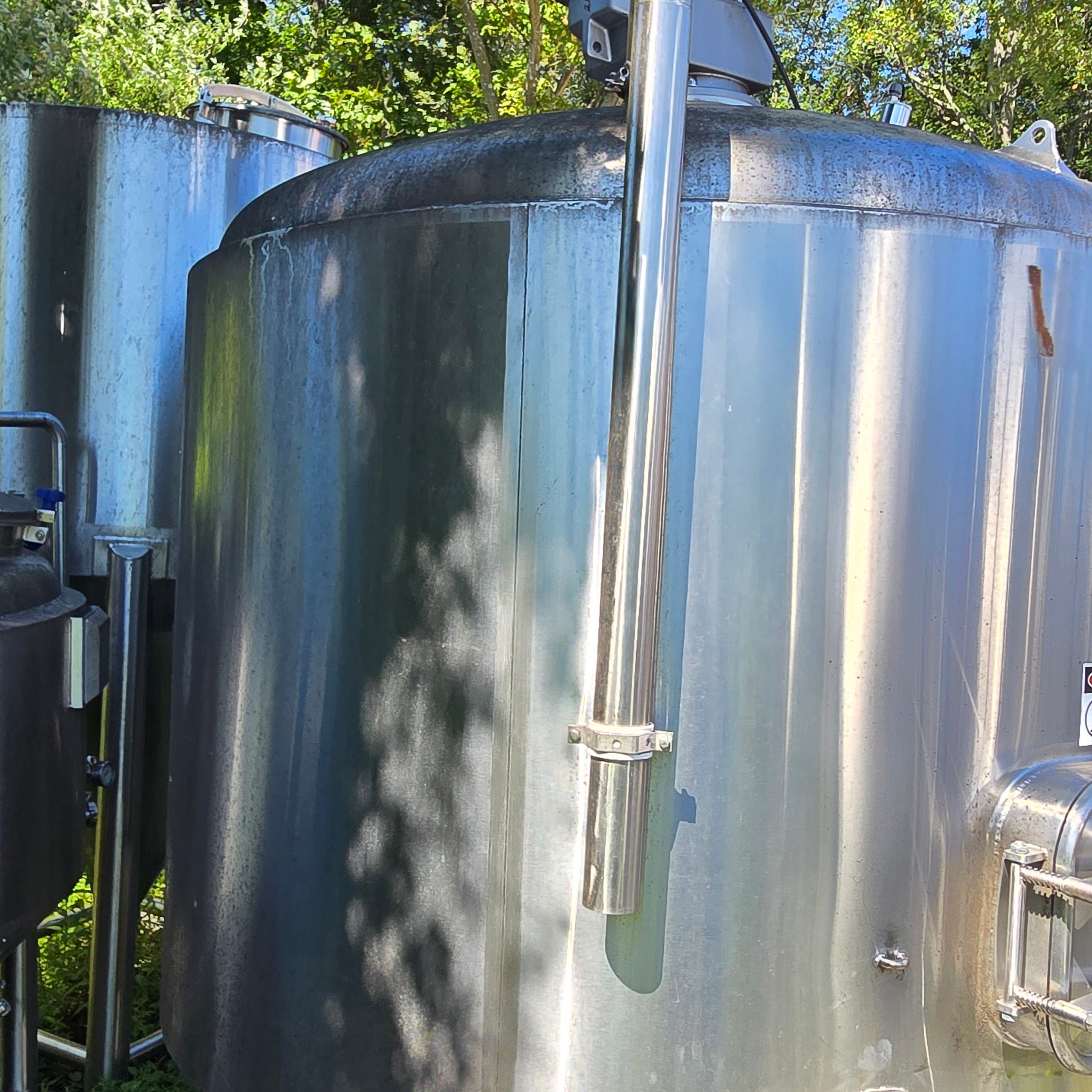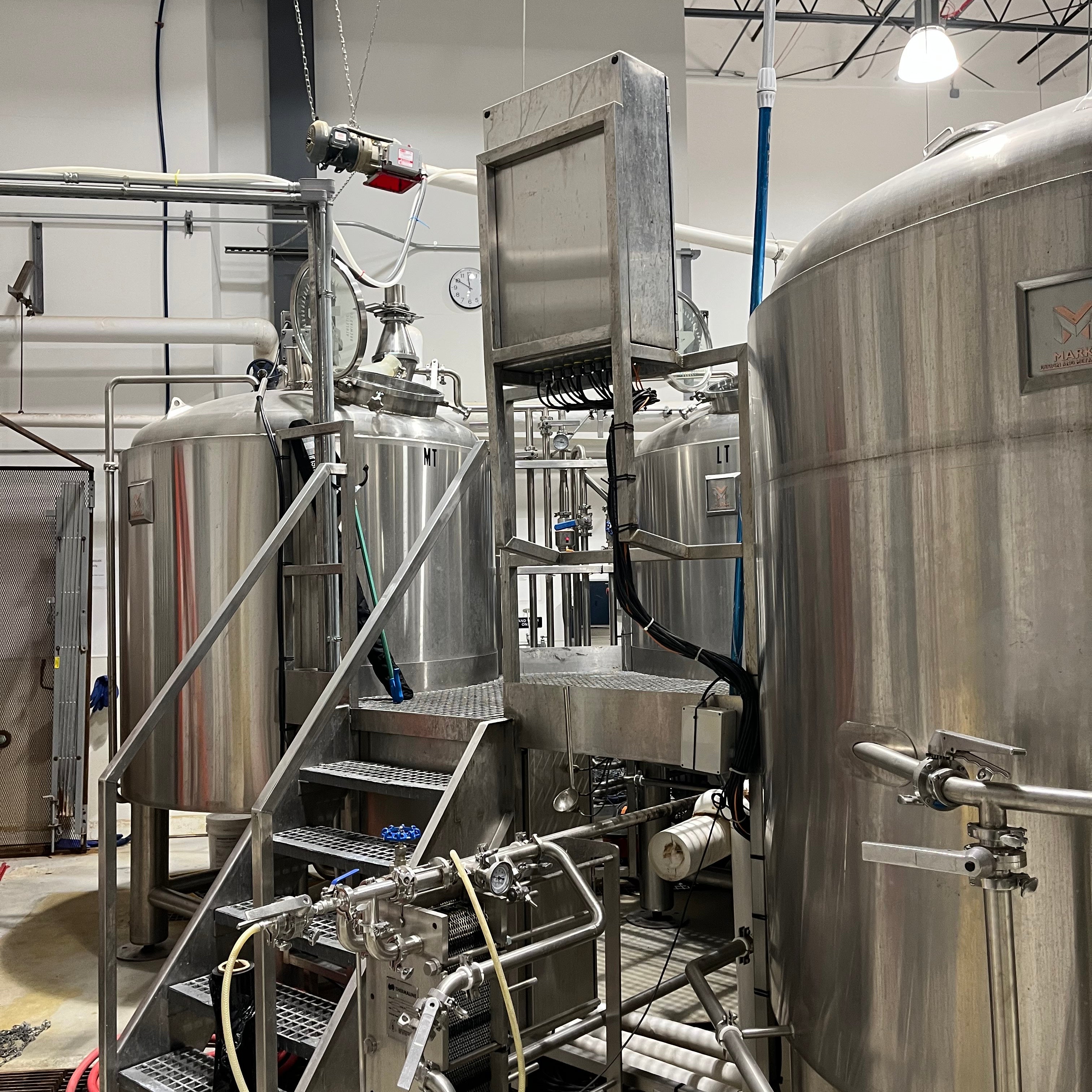 Steam jacketed mash tun with mixer, lauter tun, and kettle with whirlpool tangential