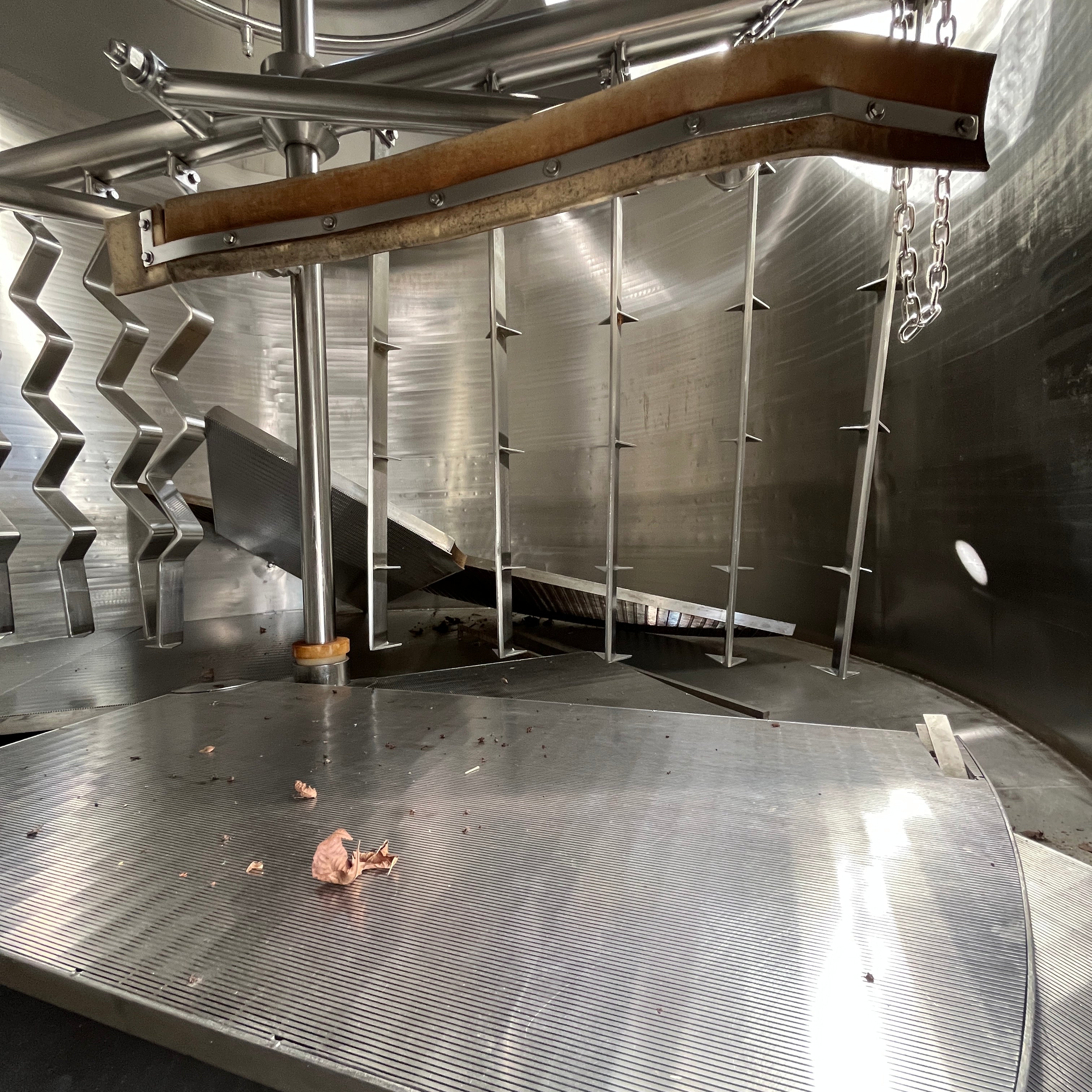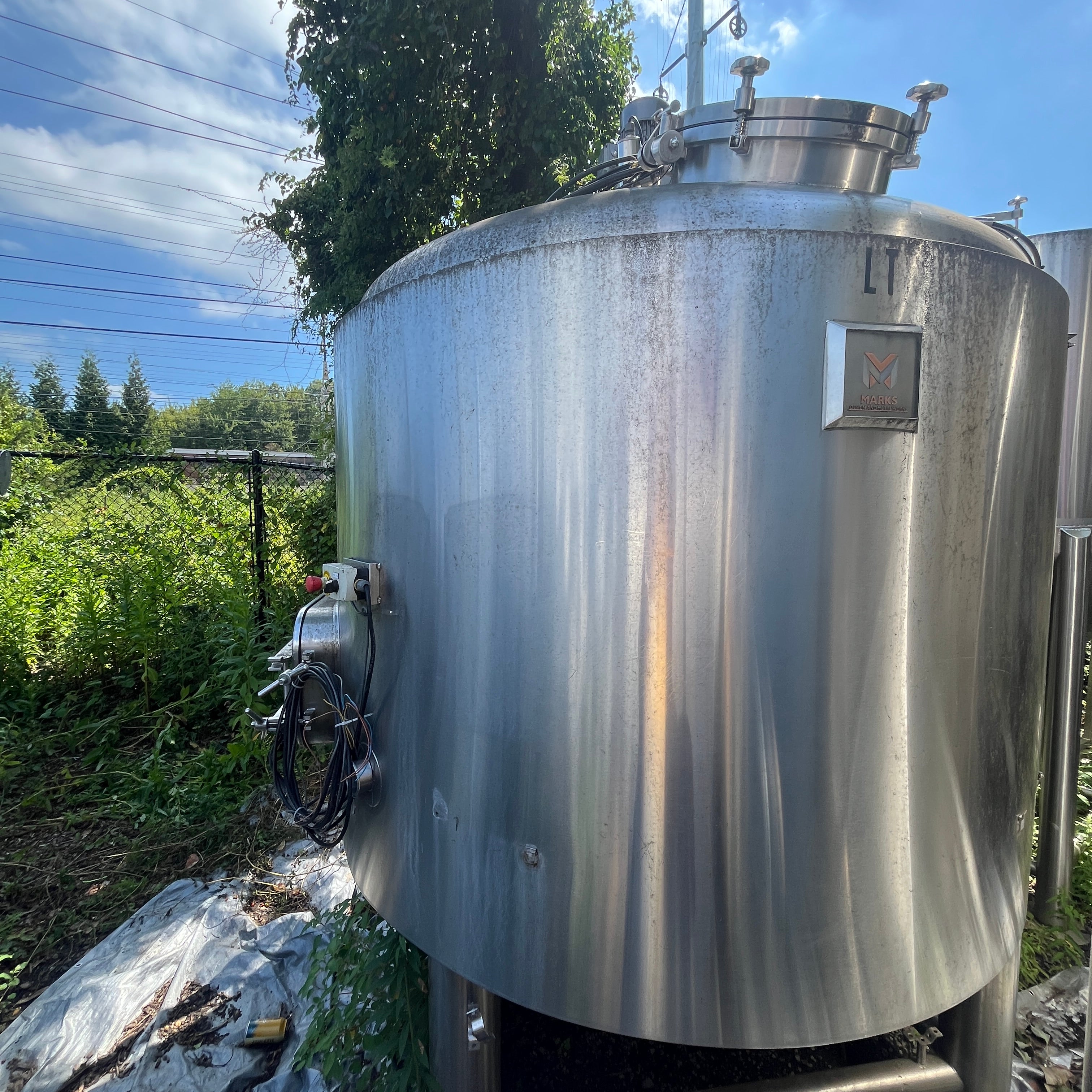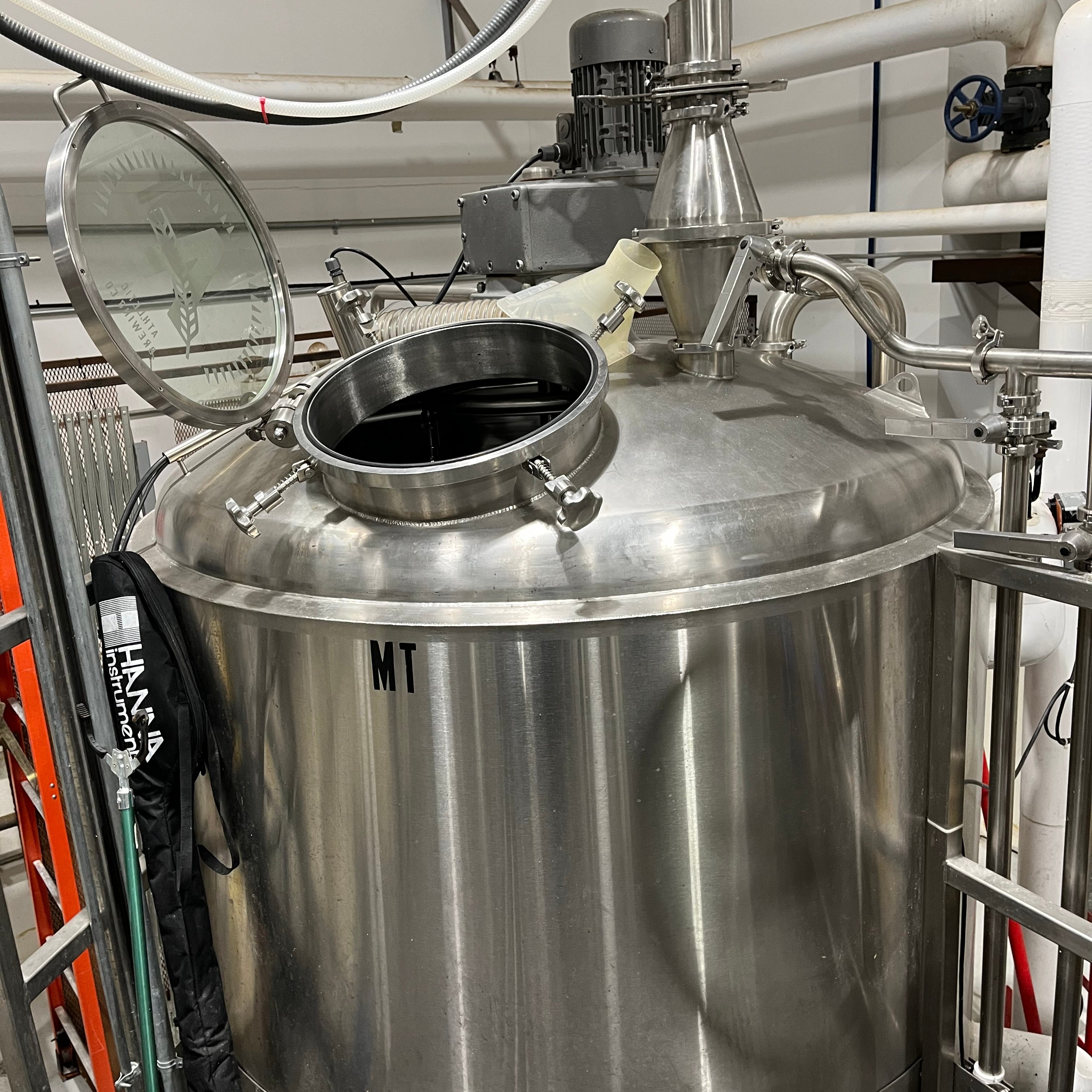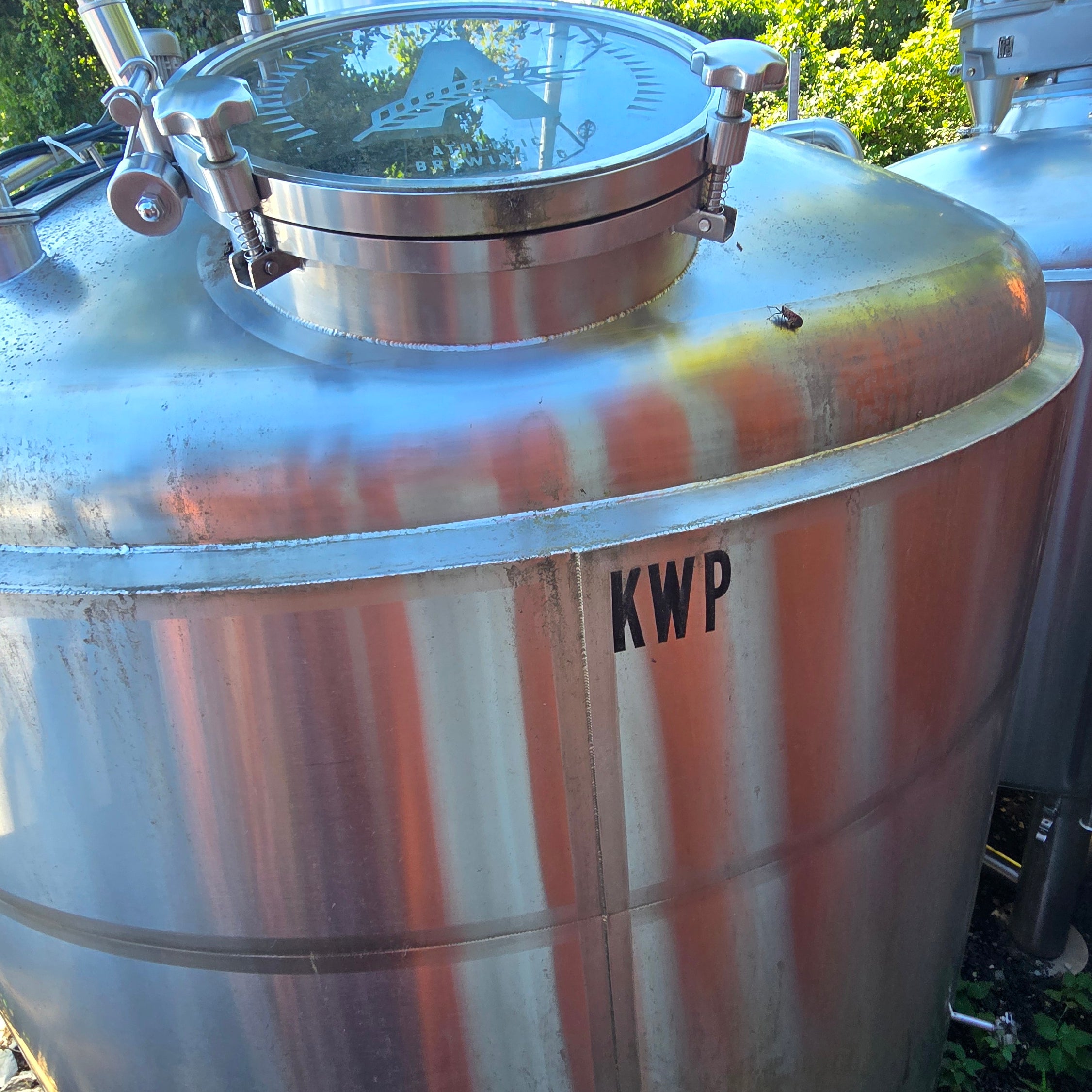 Steam jacketed mash tun with mixer, lauter tun, and kettle with whirlpool tangential
