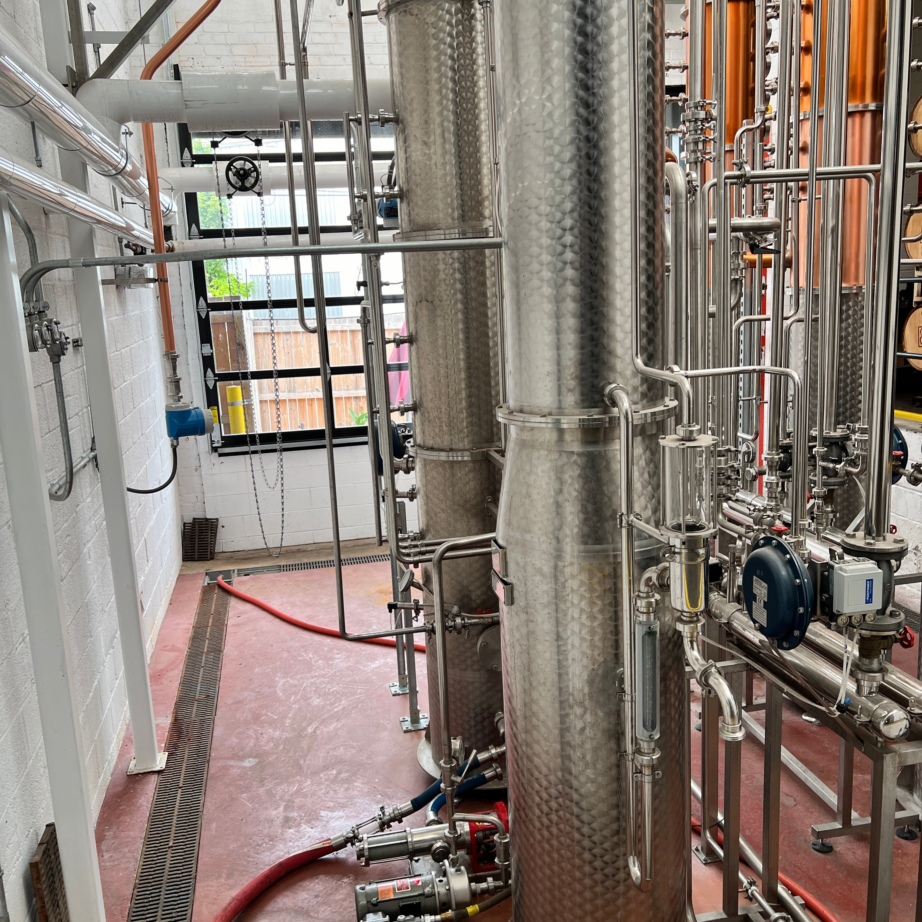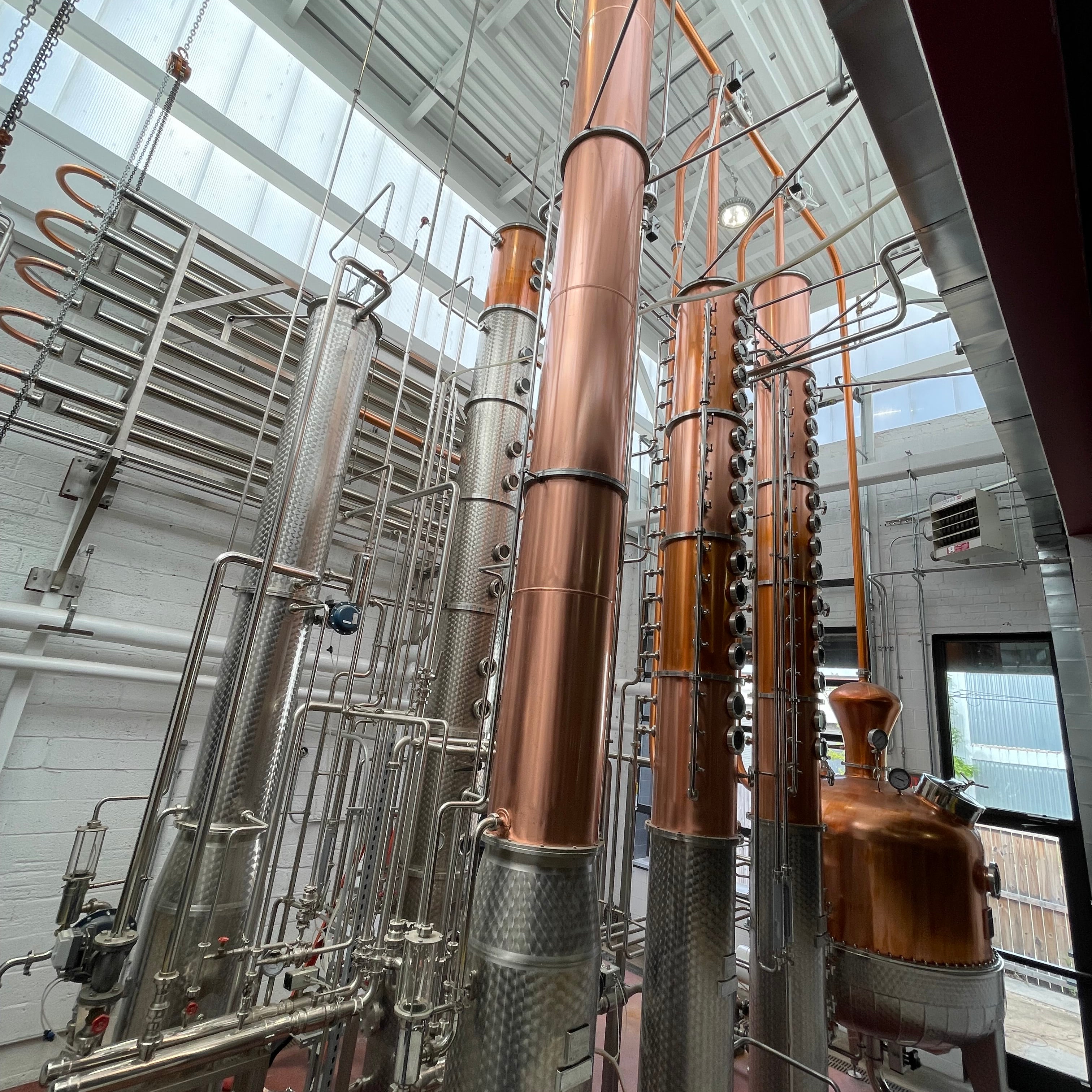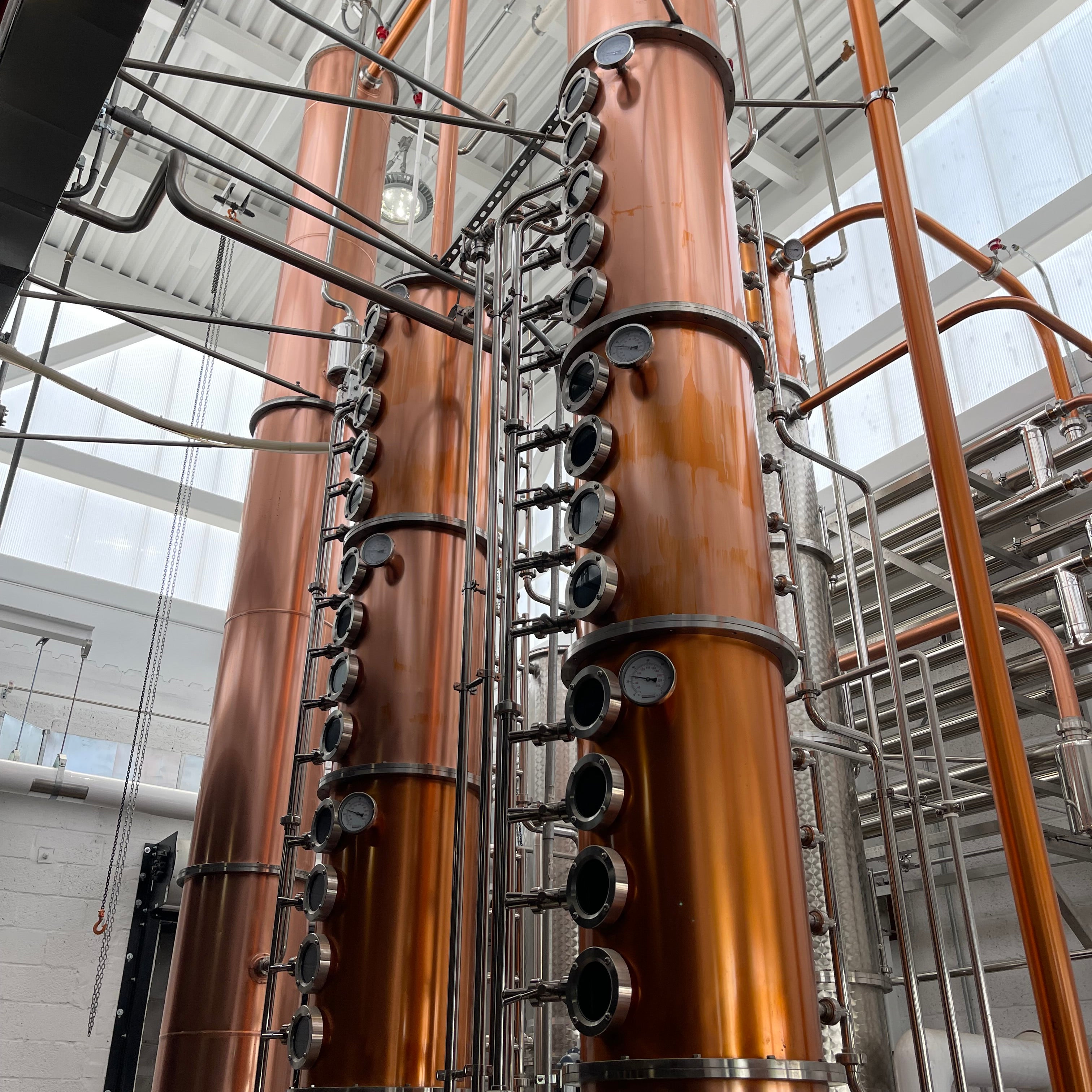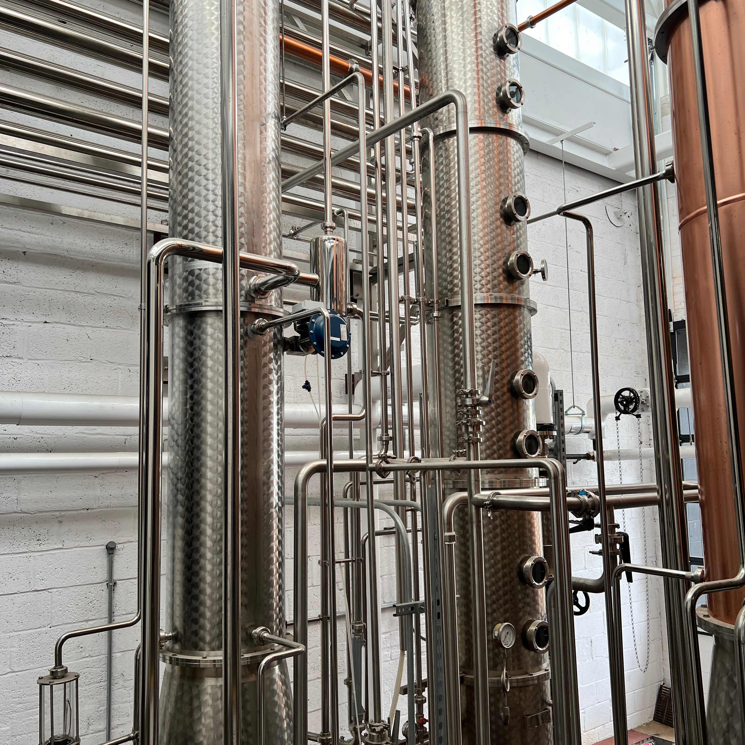 Dual copper stack rectification columns each with 15 copper plates, 15 sights, 15 CIP balls, 15 discharge valves