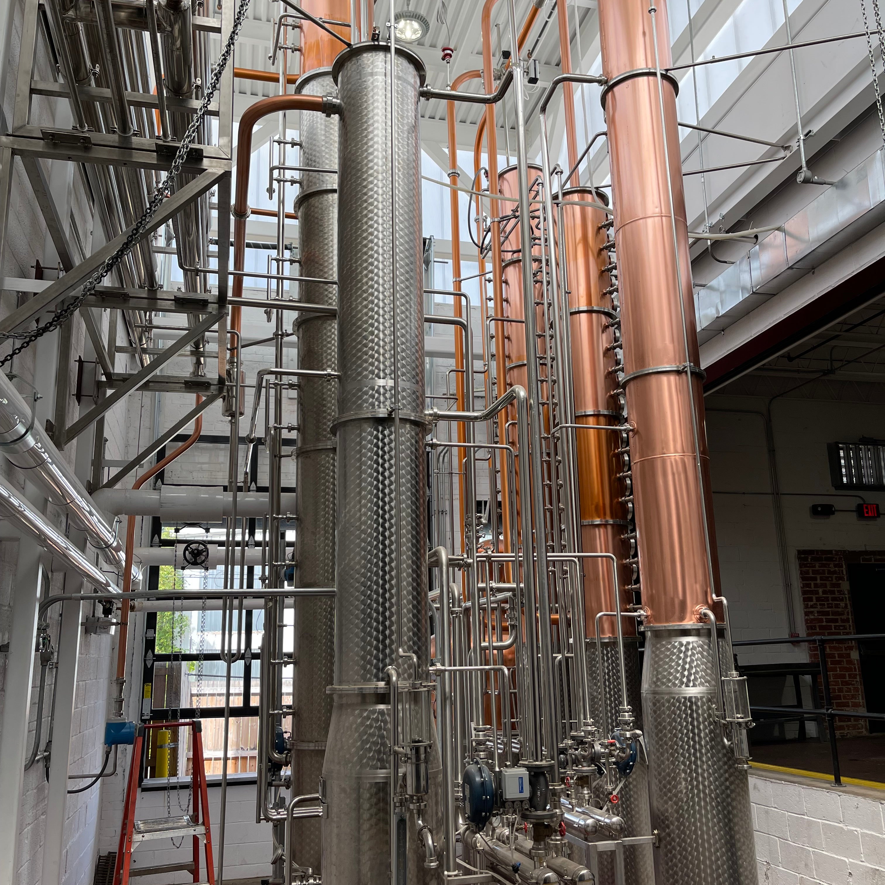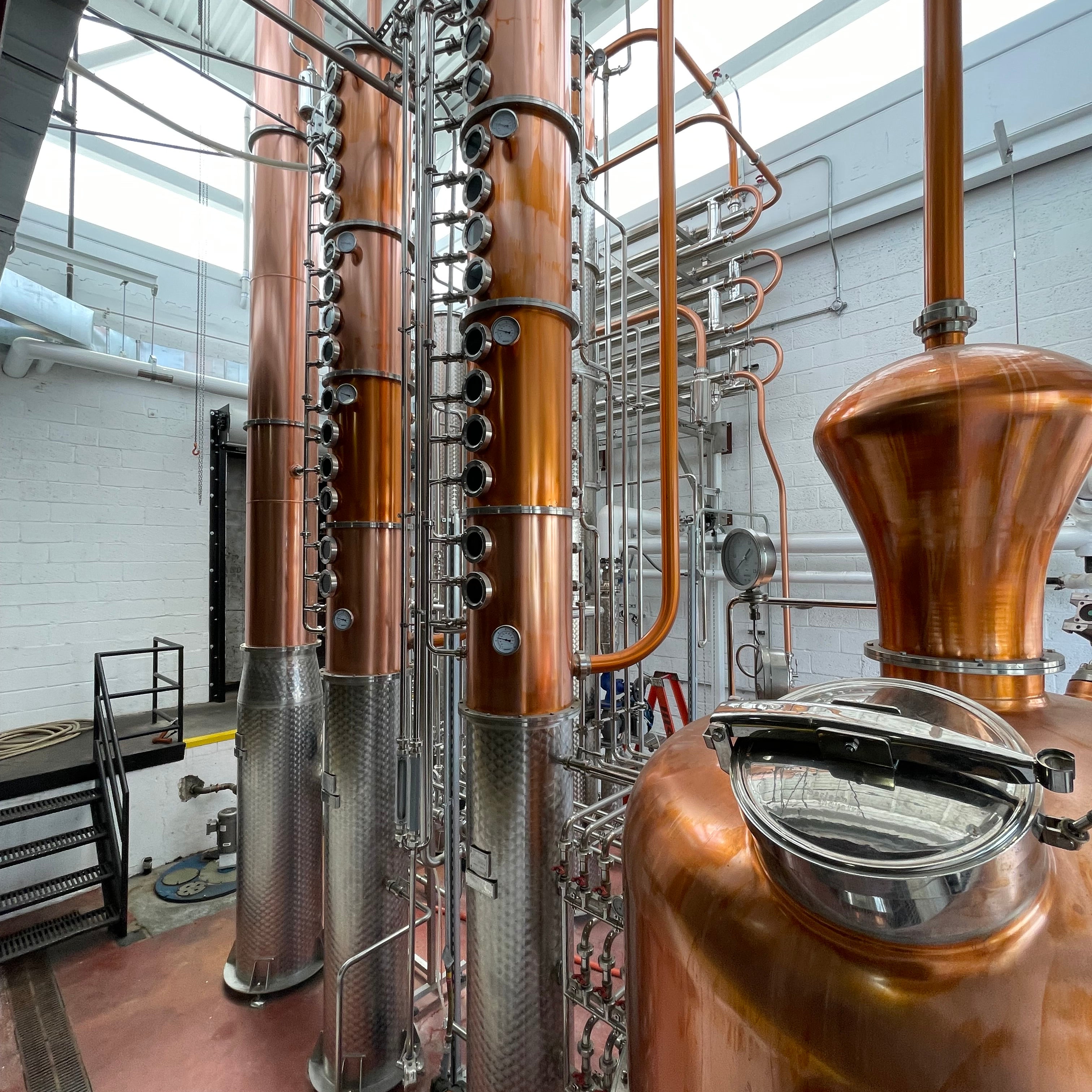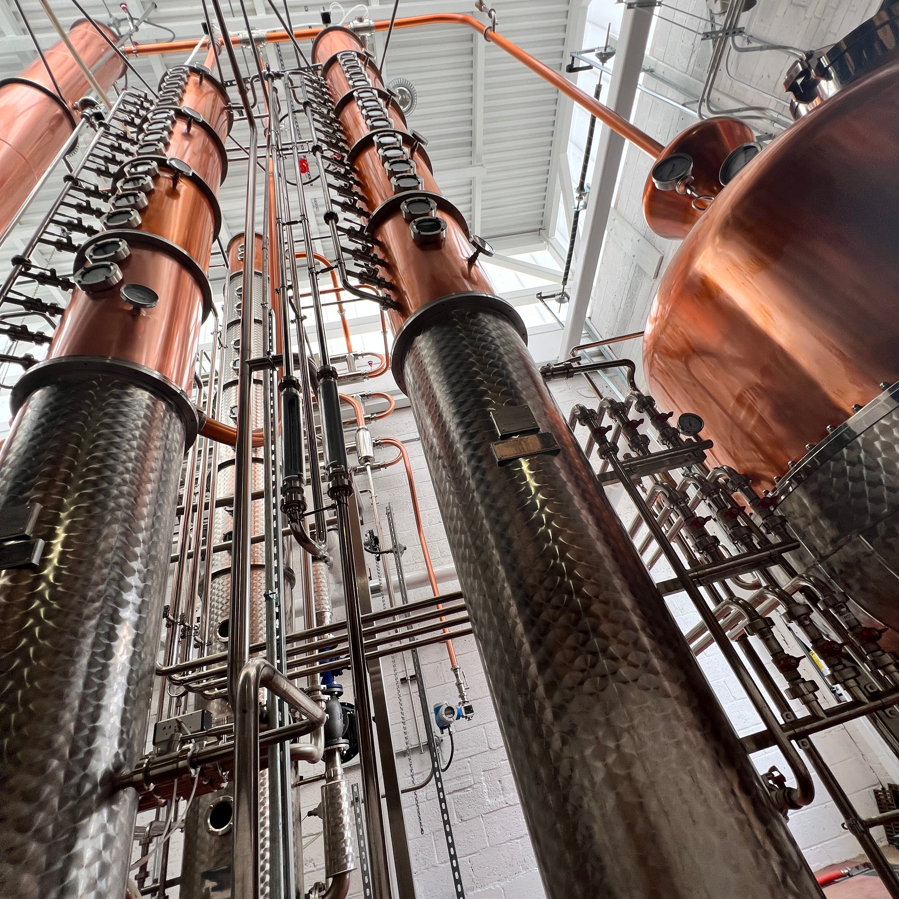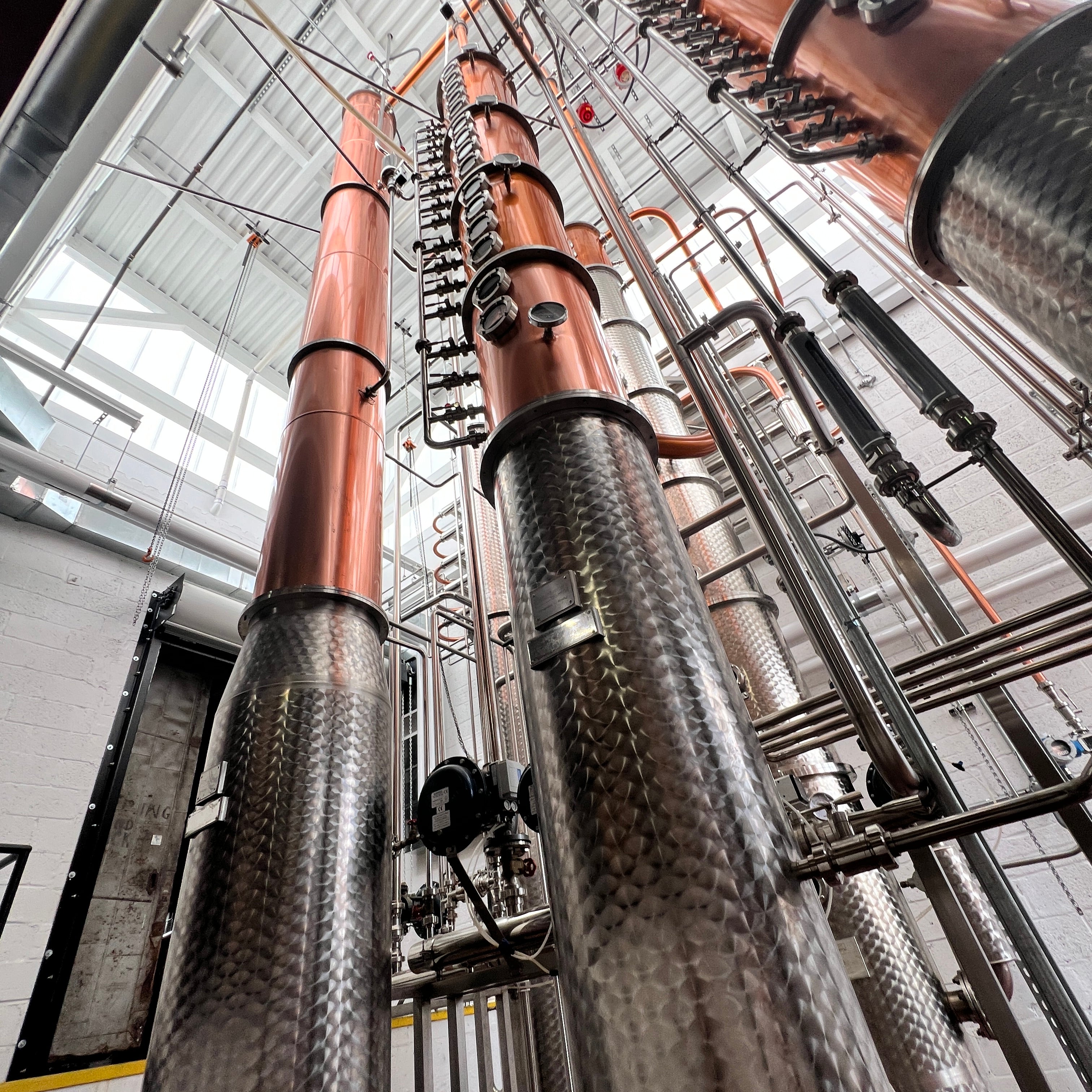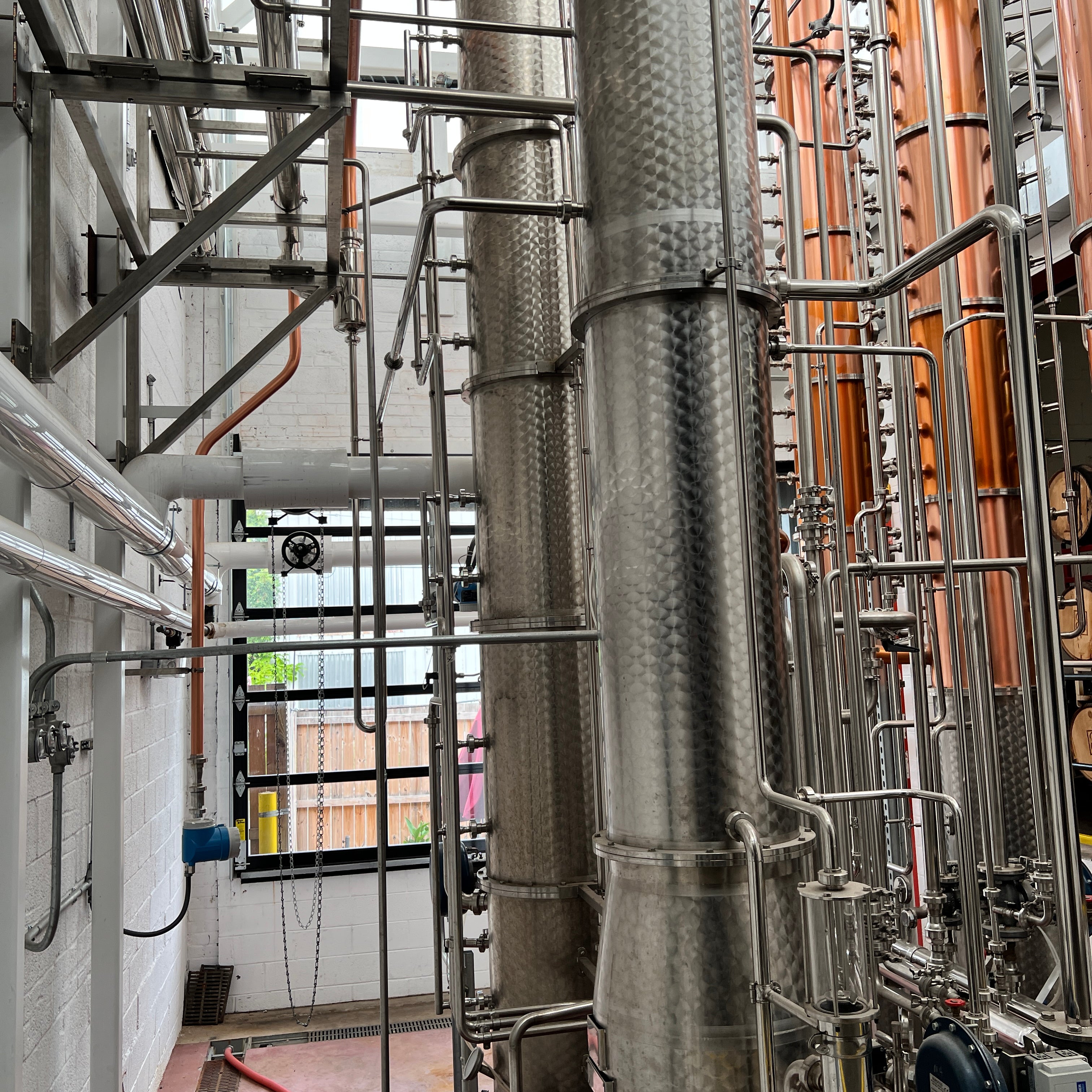 Dual copper stack rectification columns each with 15 copper plates, 15 sights, 15 CIP balls, 15 discharge valves