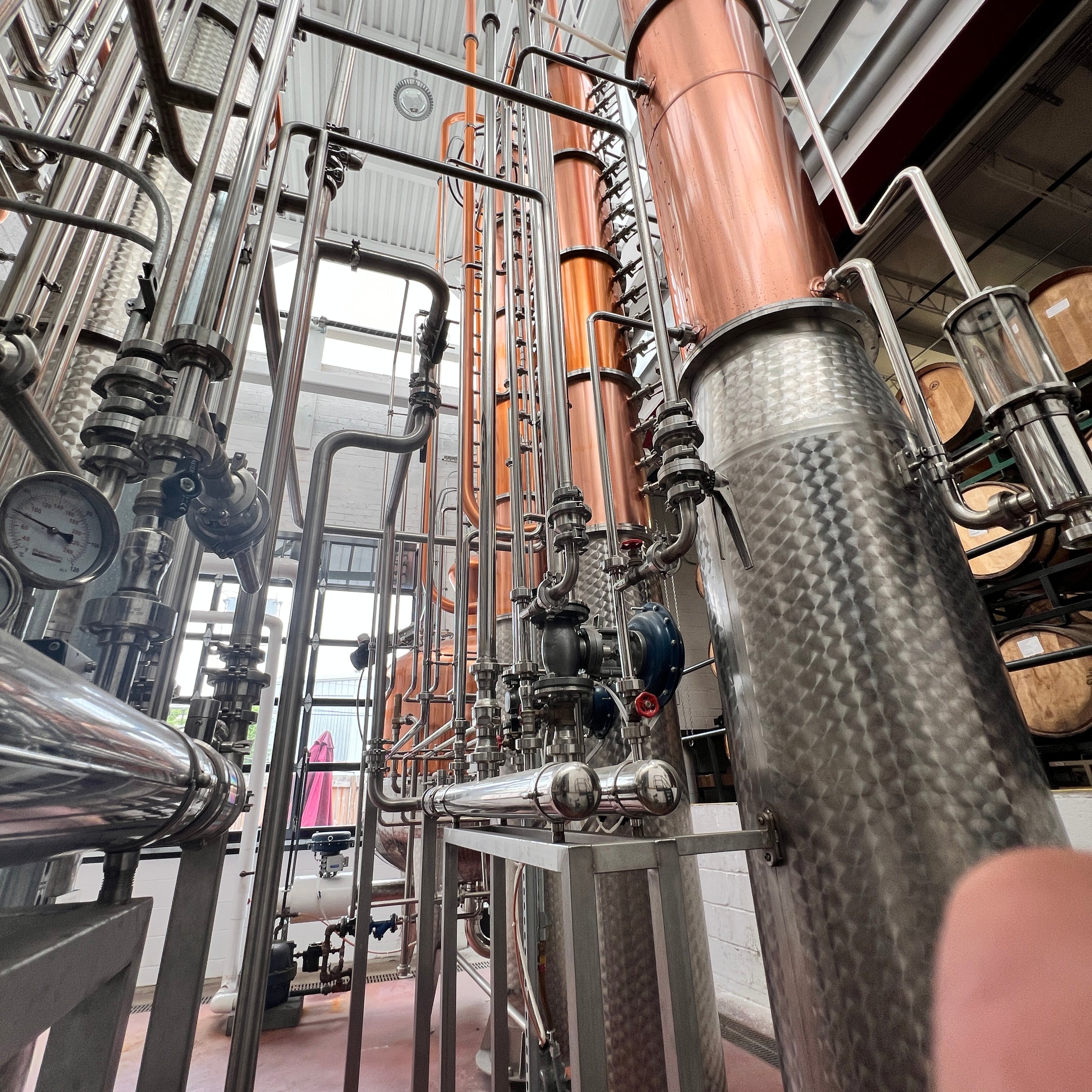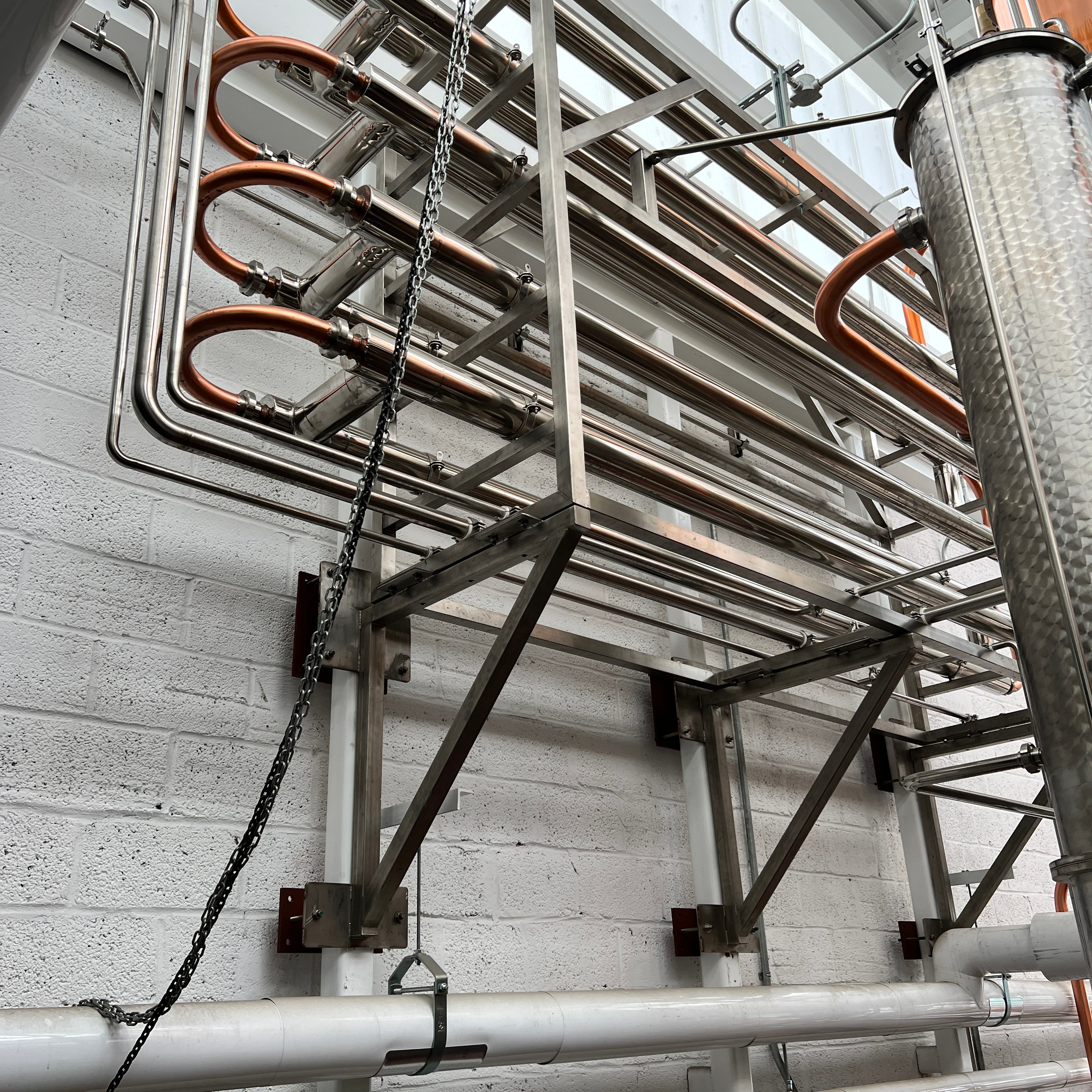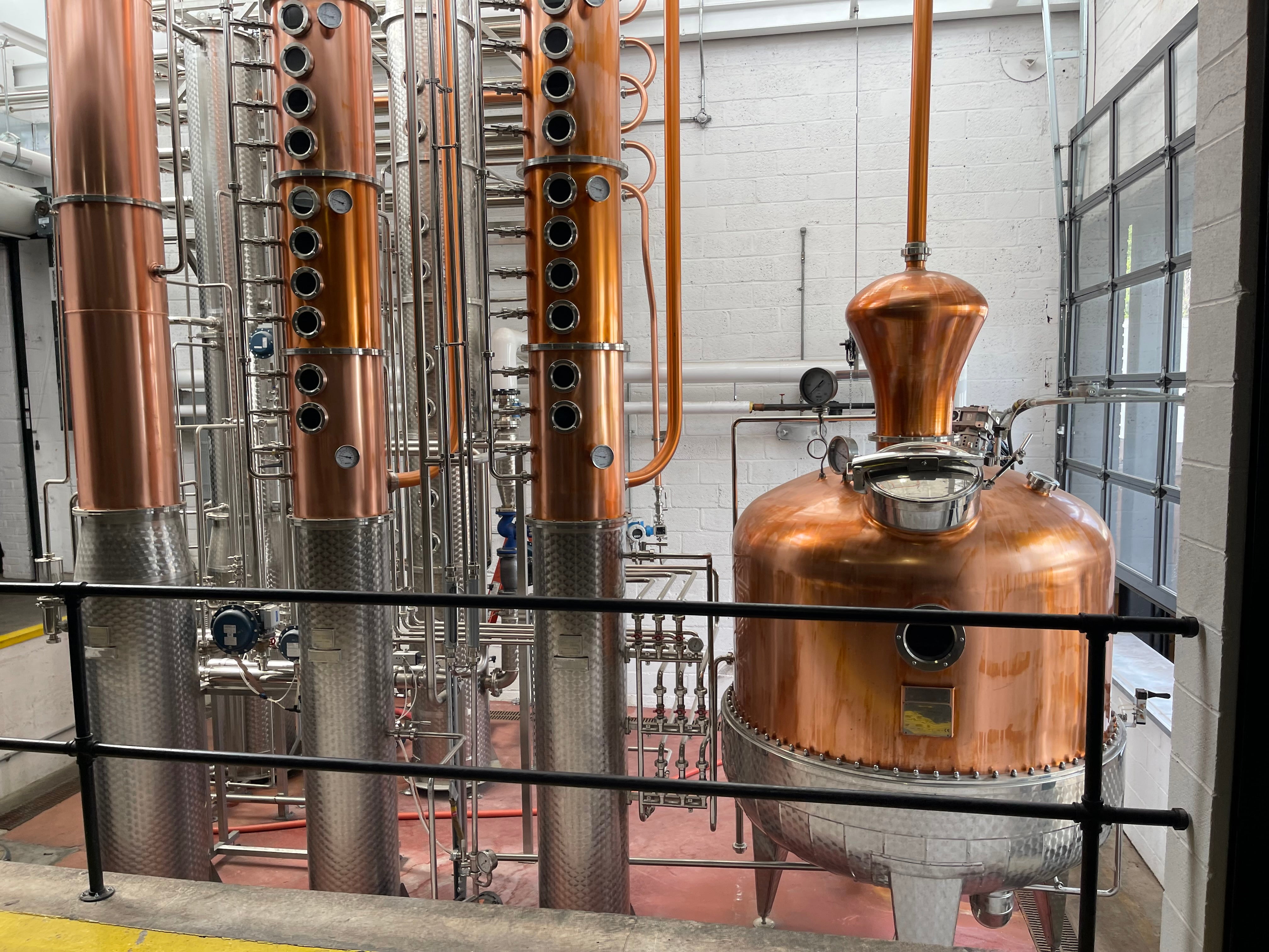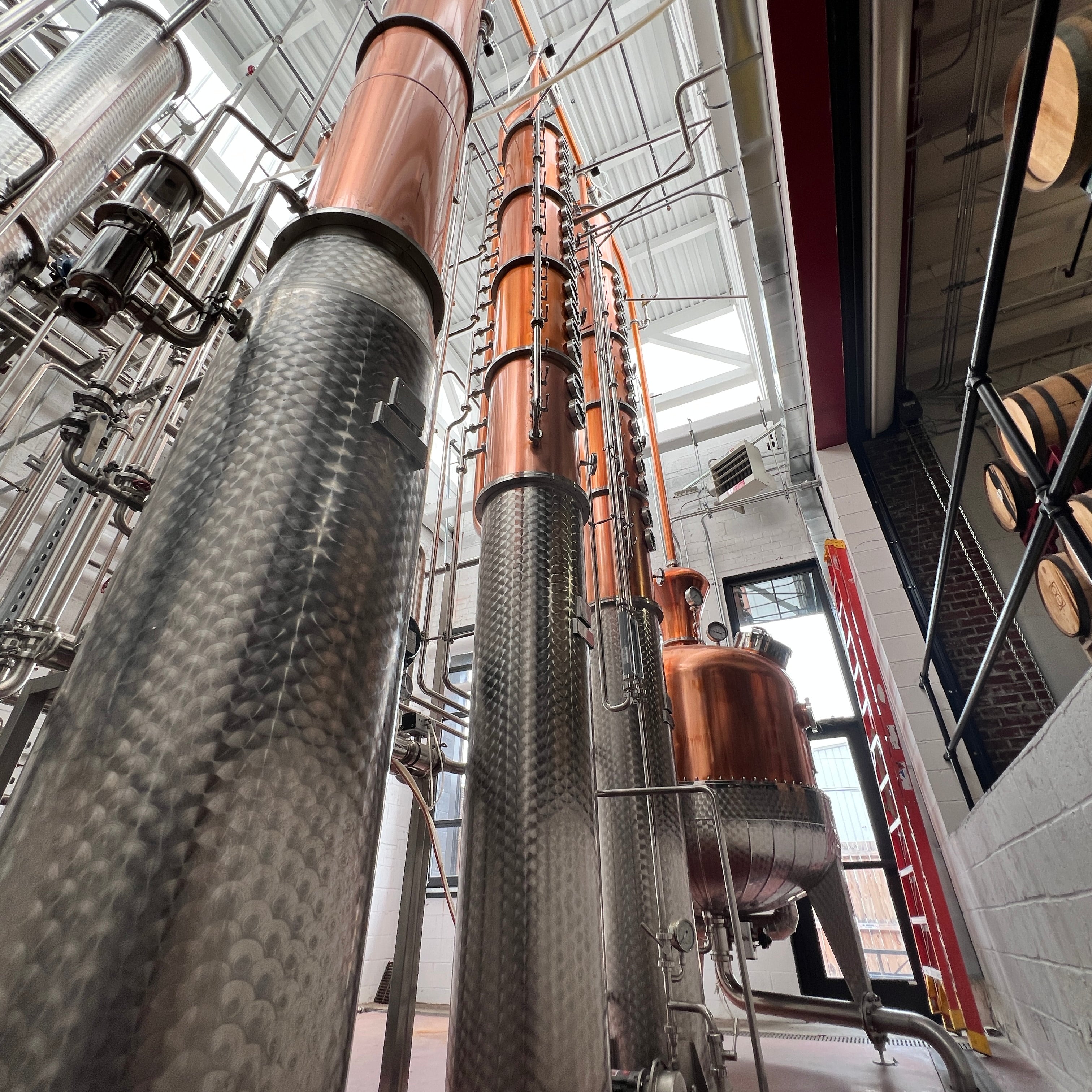 Dual copper stack rectification columns each with 15 copper plates, 15 sights, 15 CIP balls, 15 discharge valves