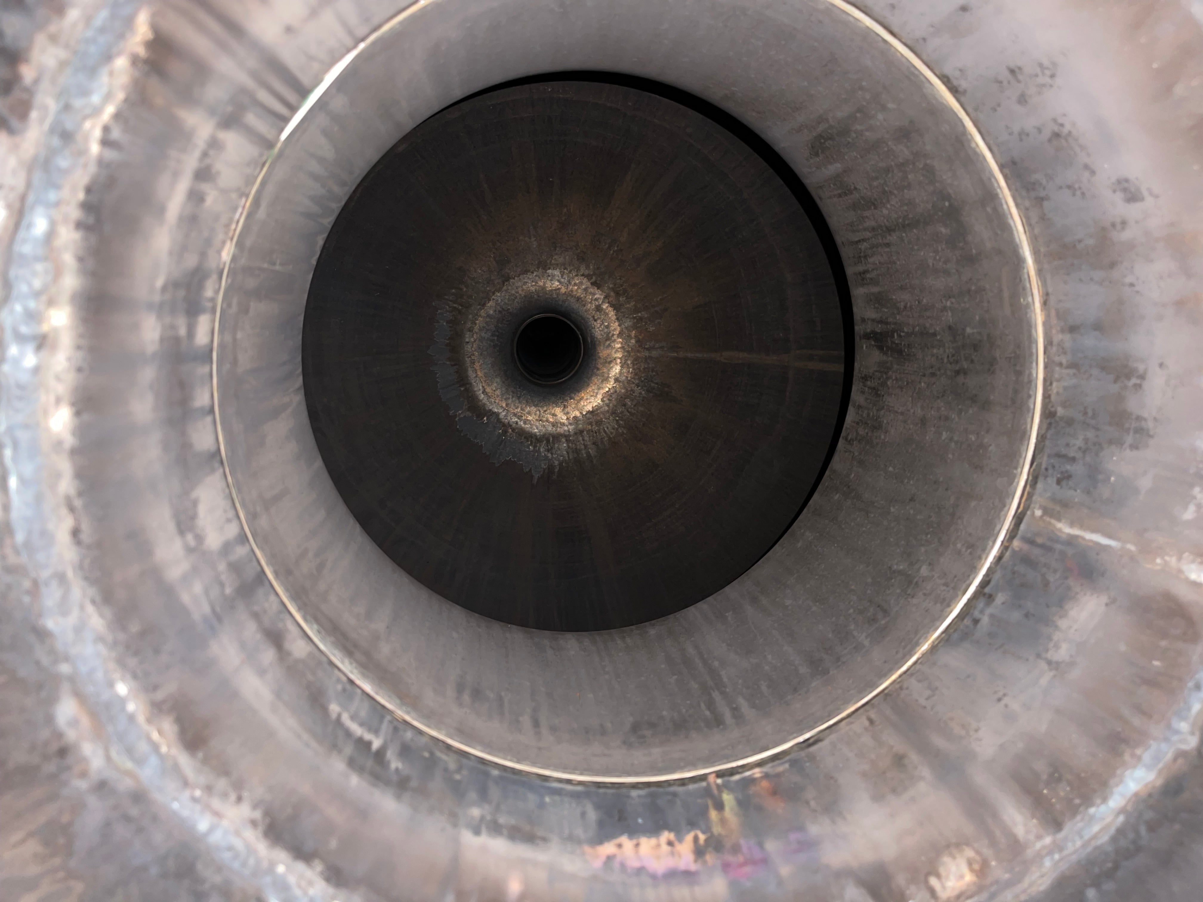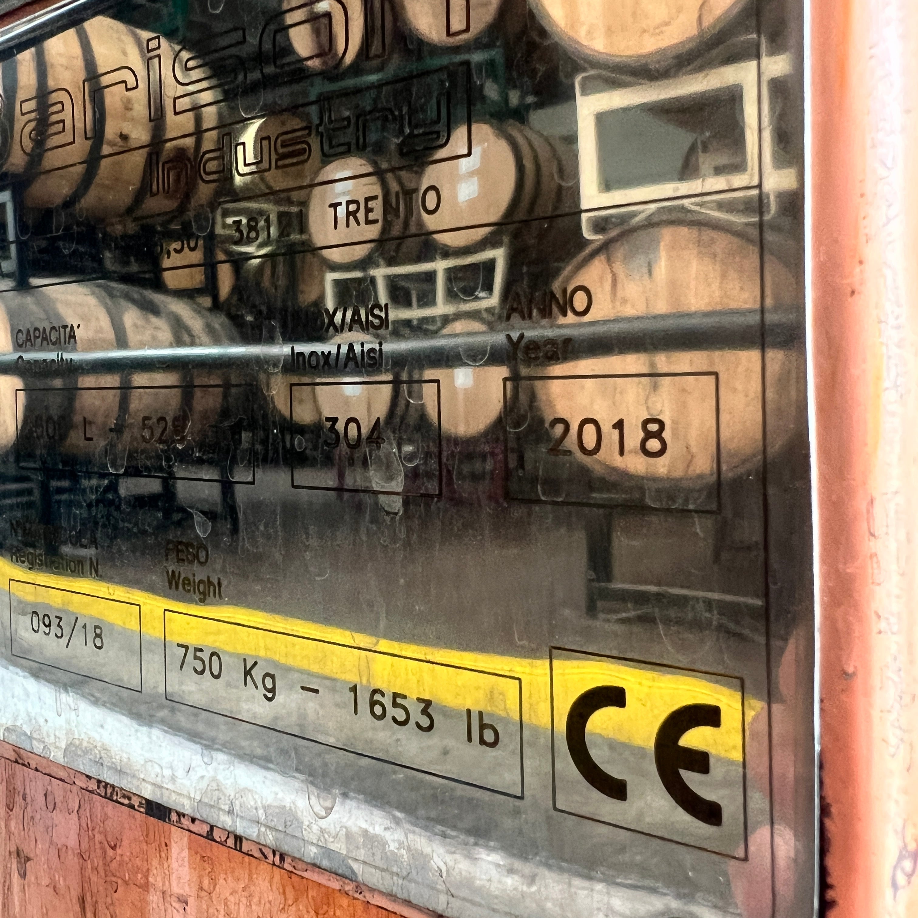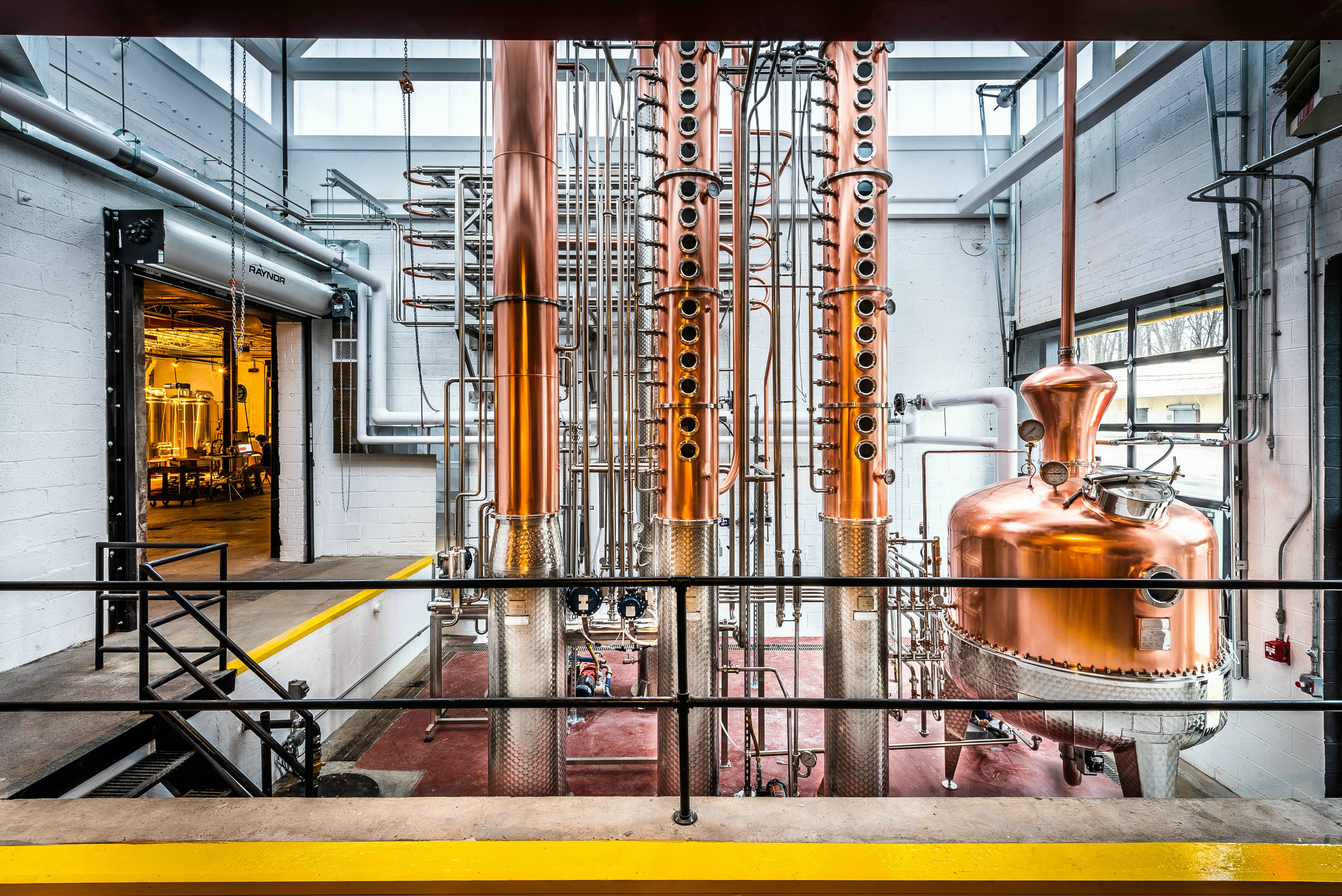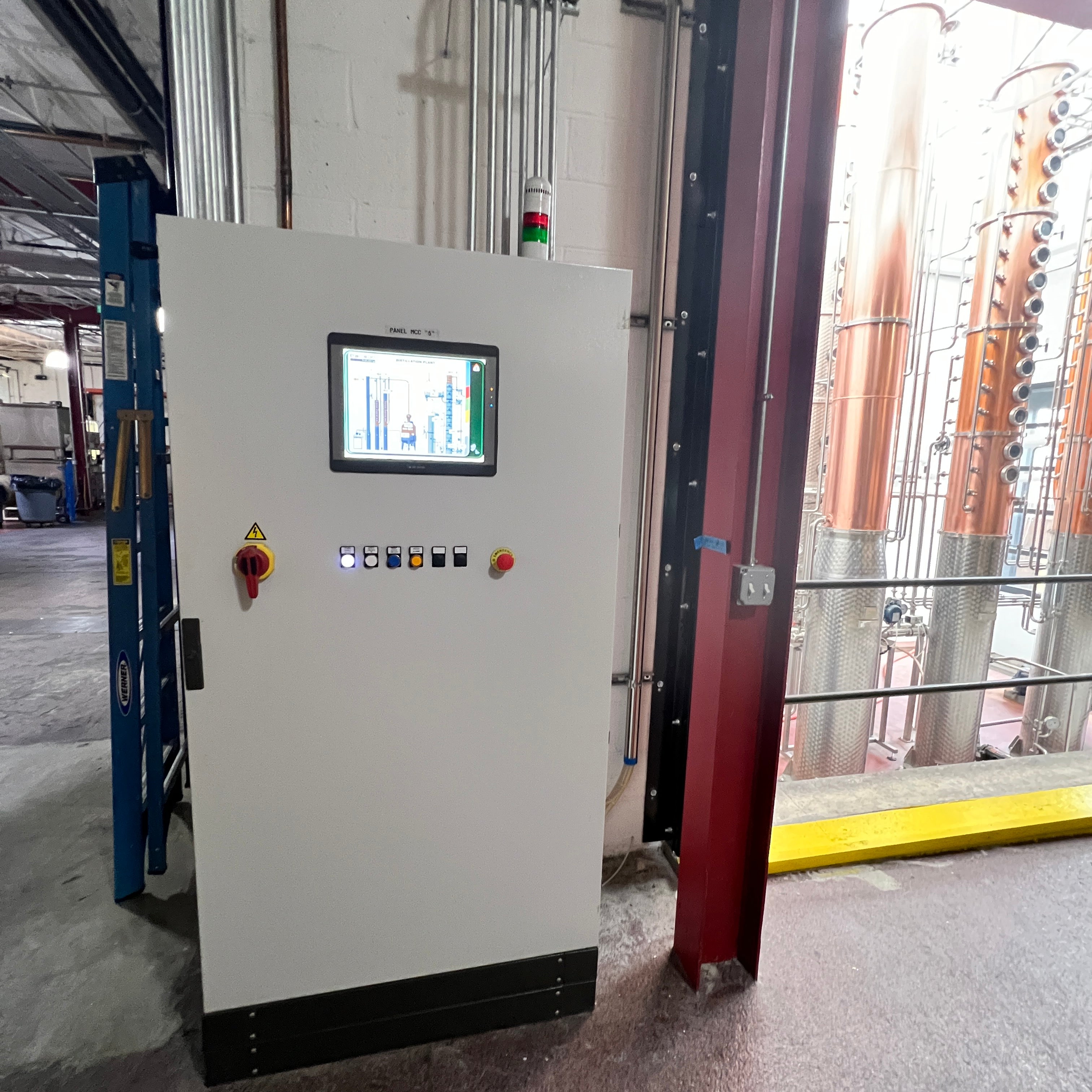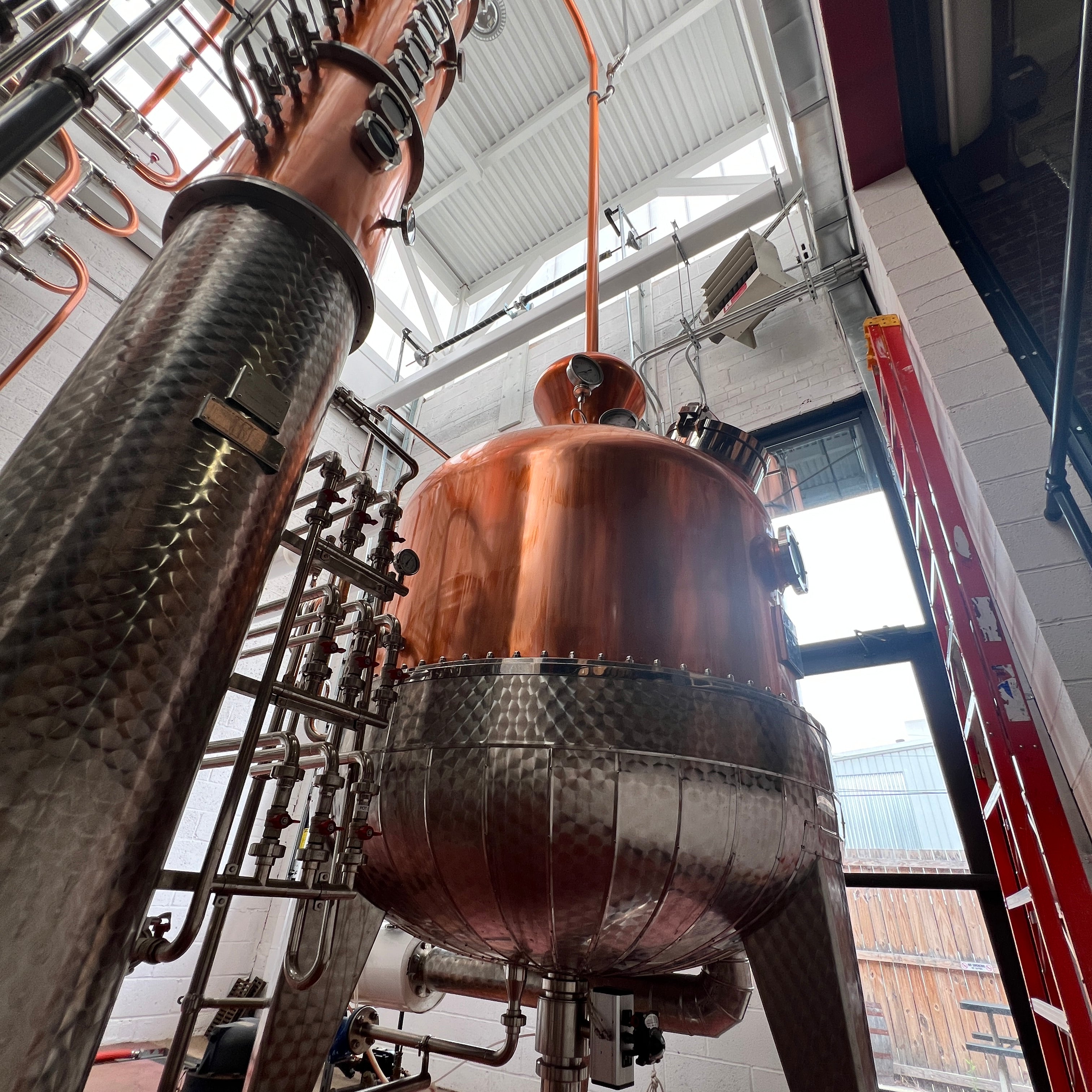 Dual copper stack rectification columns each with 15 copper plates, 15 sights, 15 CIP balls, 15 discharge valves