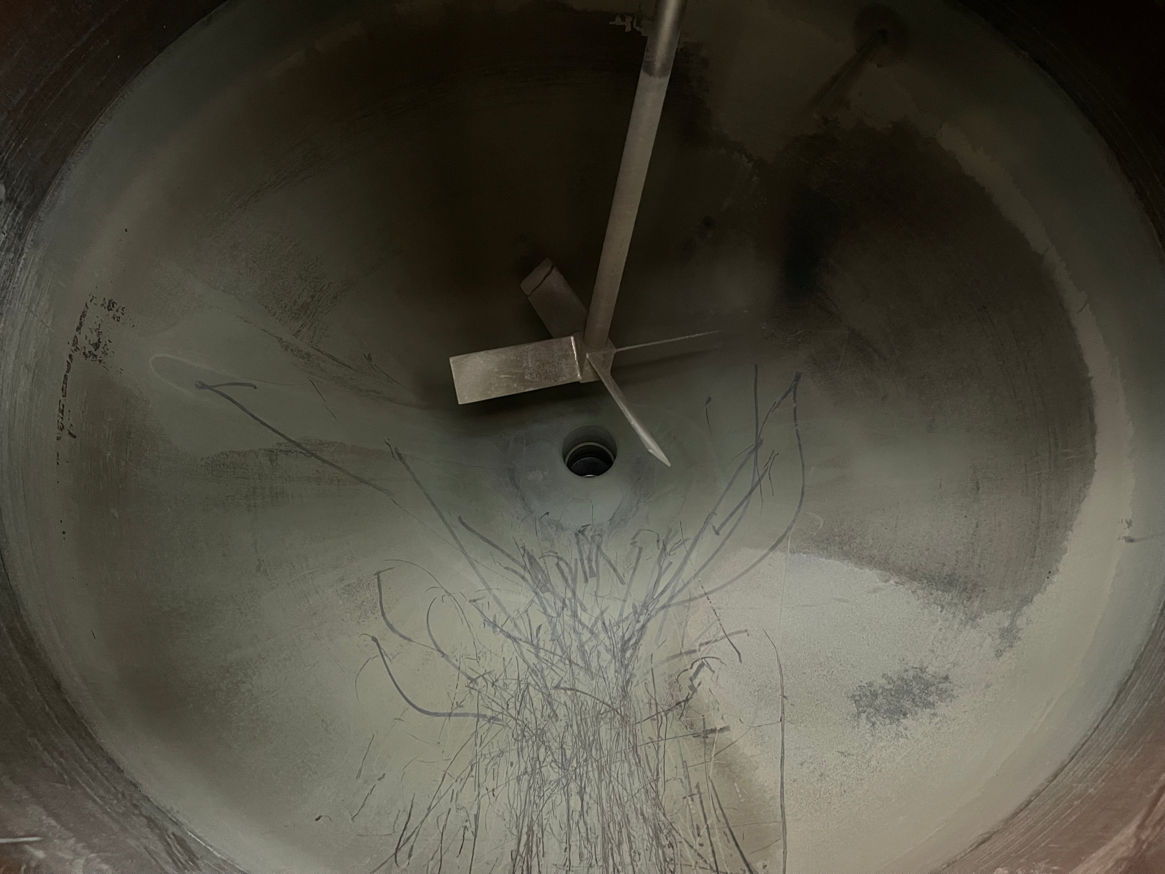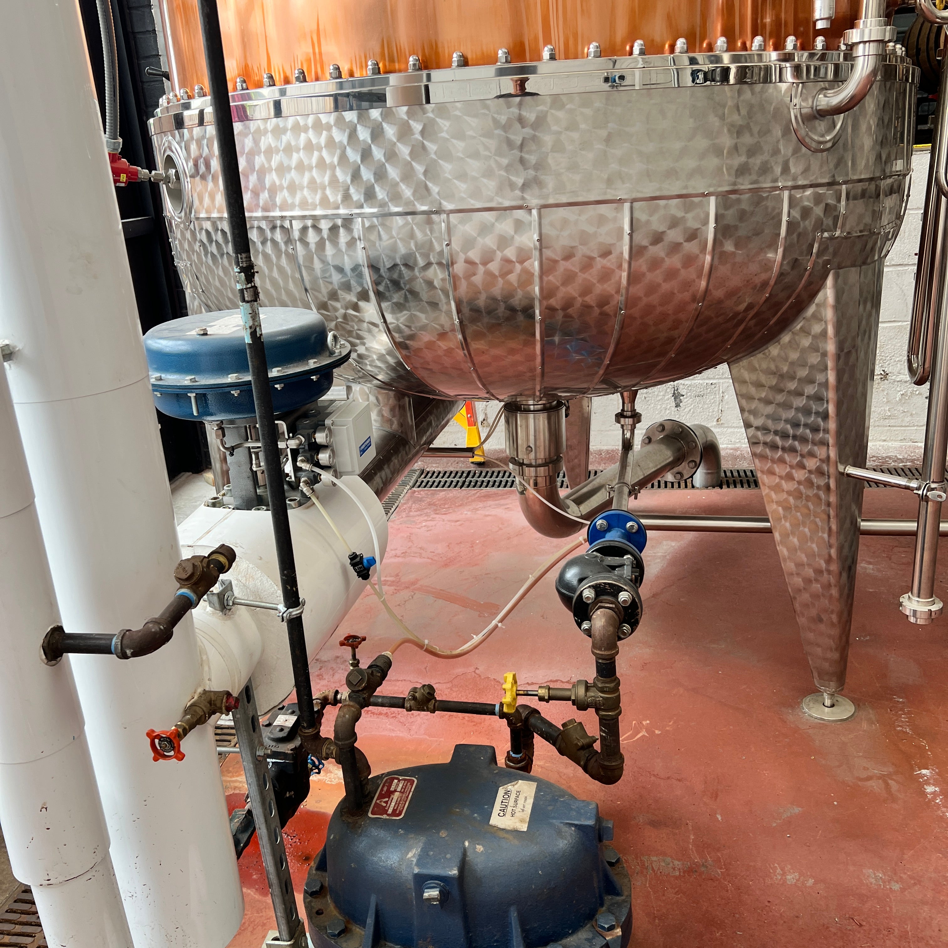 Stainless steam kettle with sparger, flow meter, level control, pump, and pneumatic drain