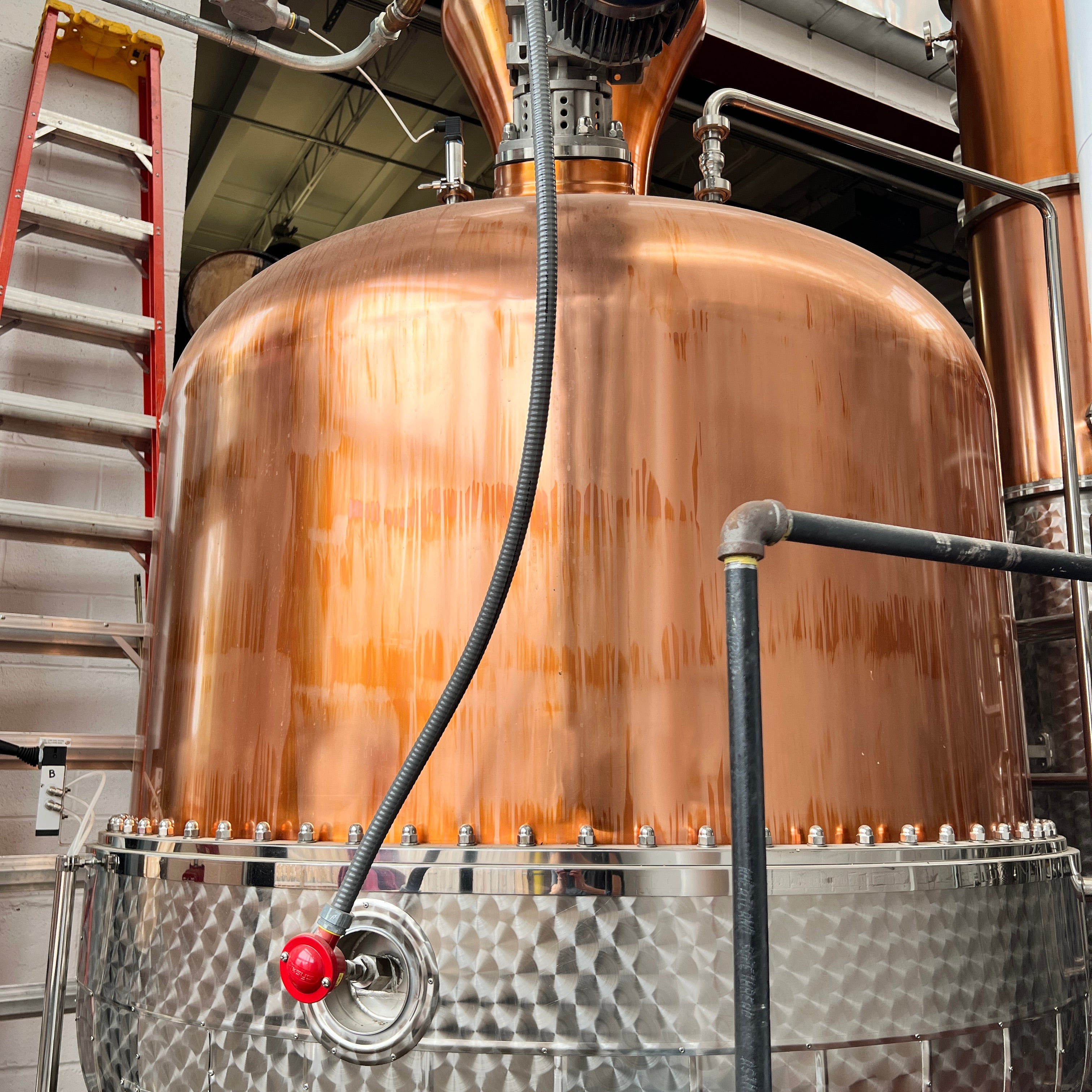 Copper pot still includes manometer, copper onion, pneumatic discharge, explosion proof agitator, and bypass to condenser
