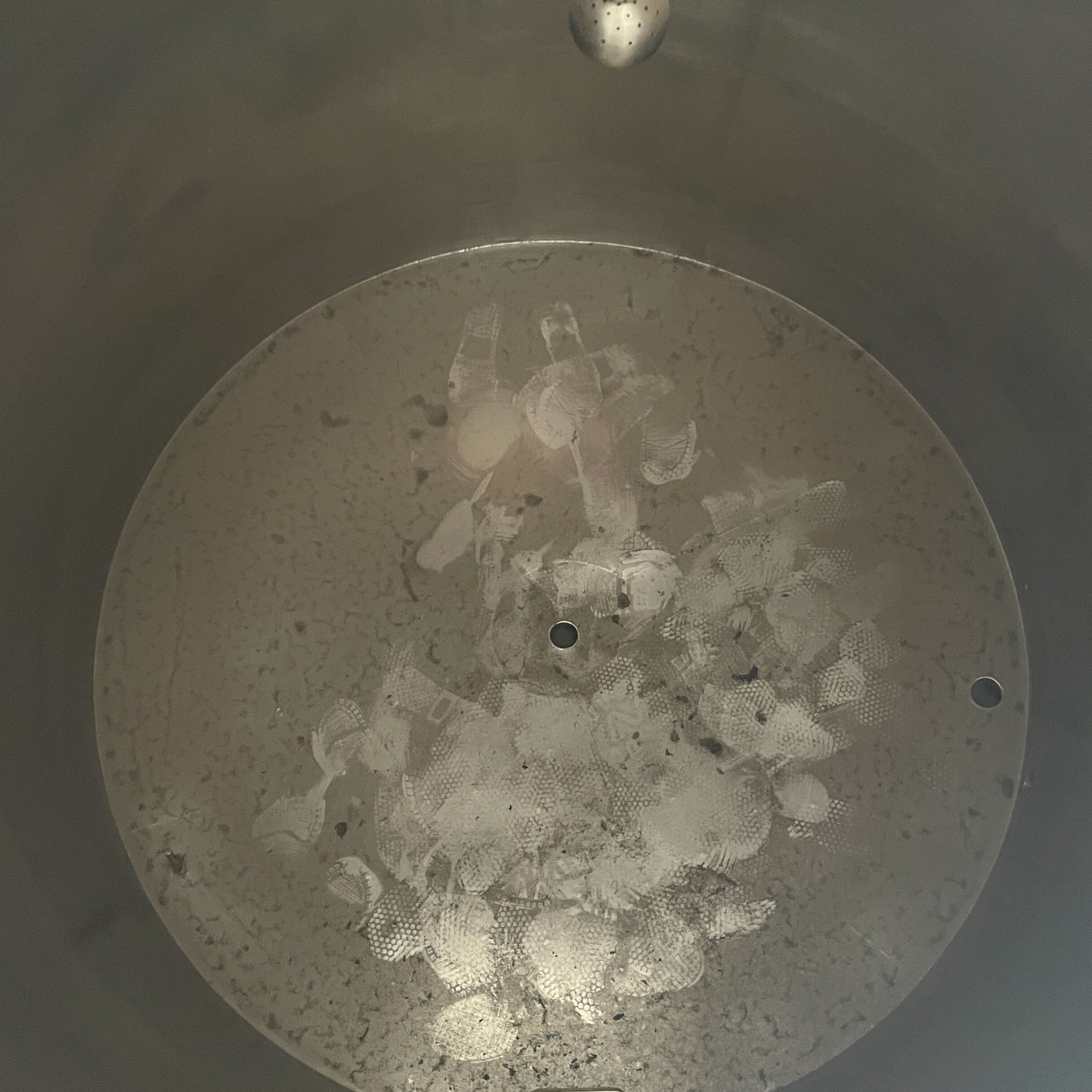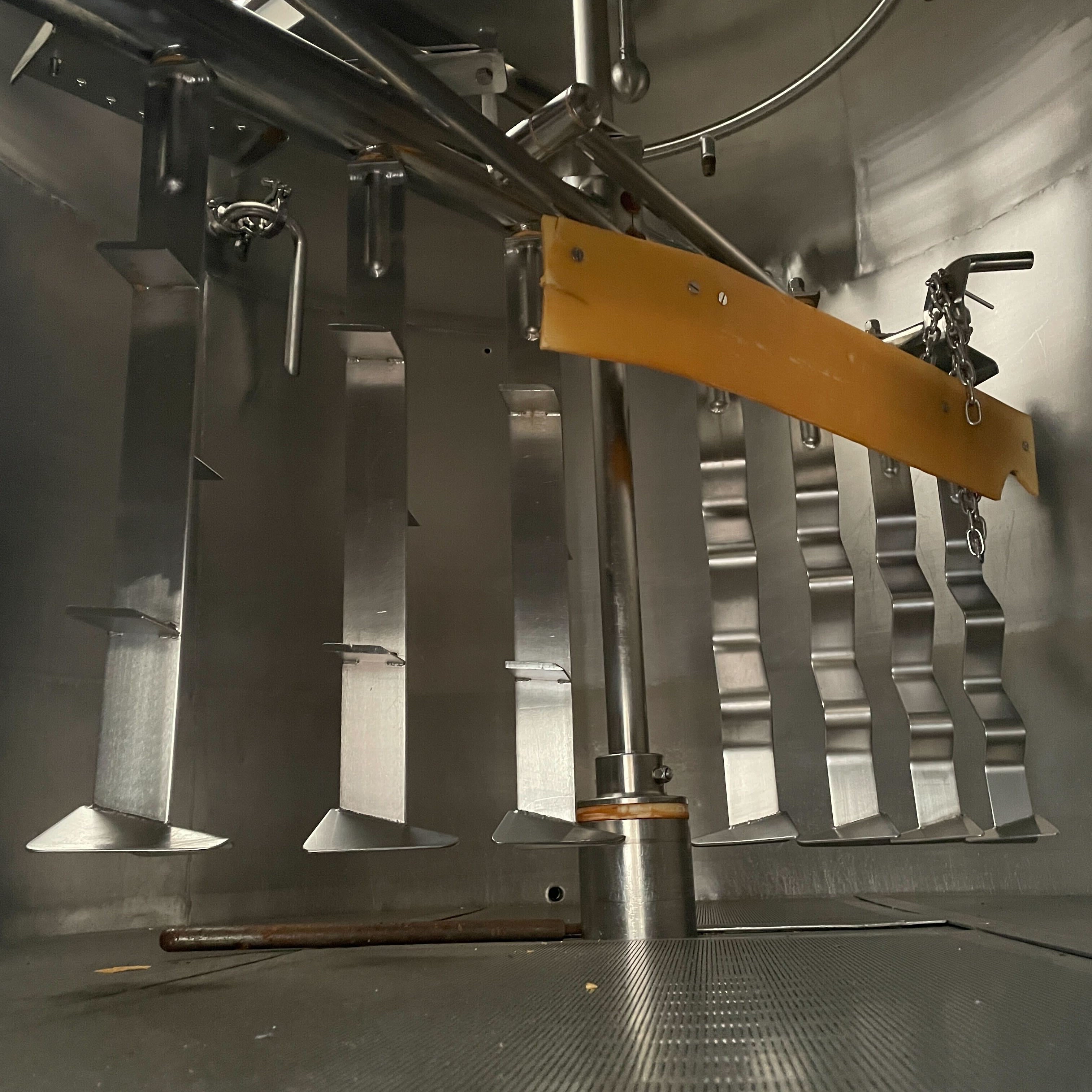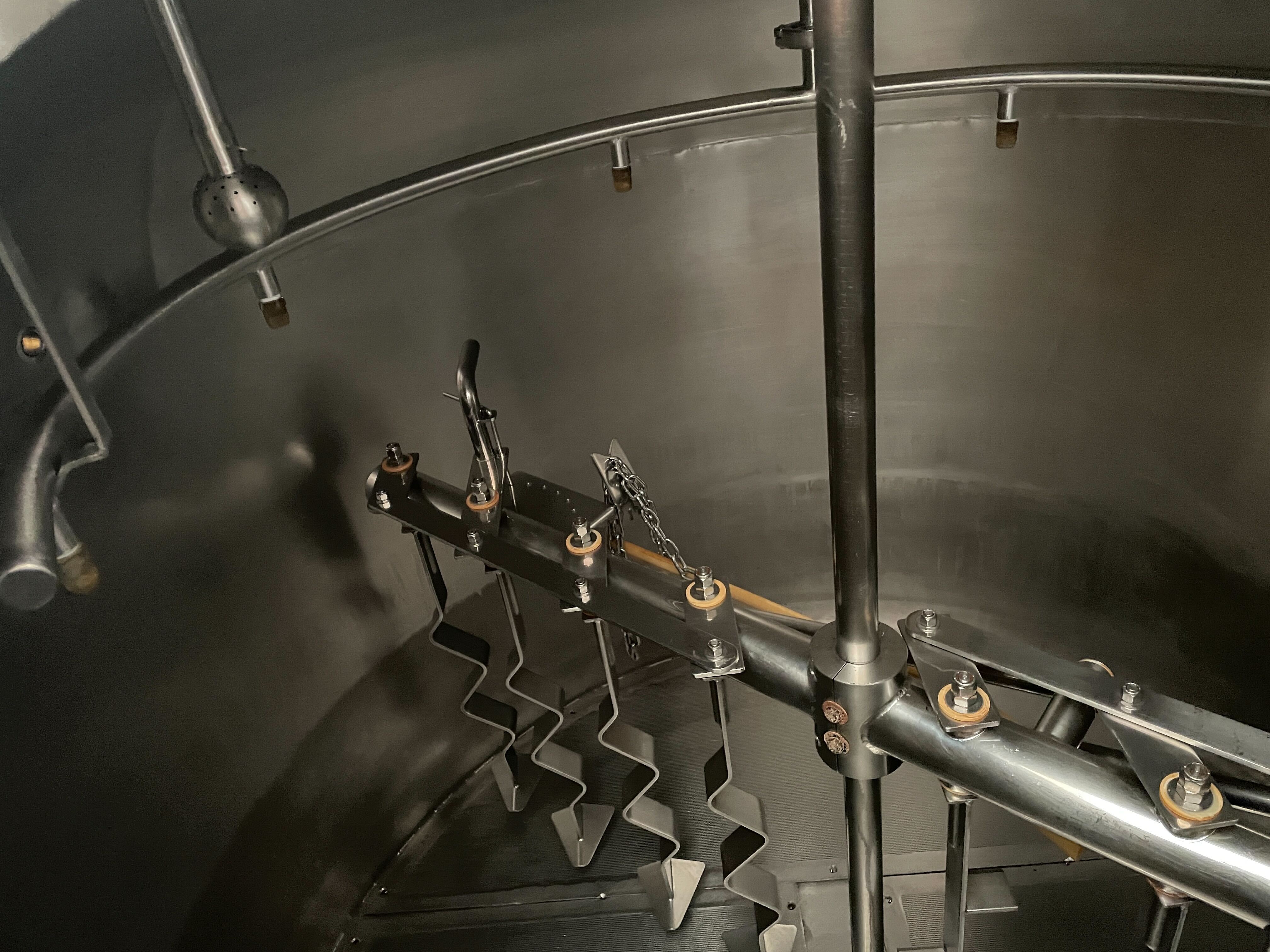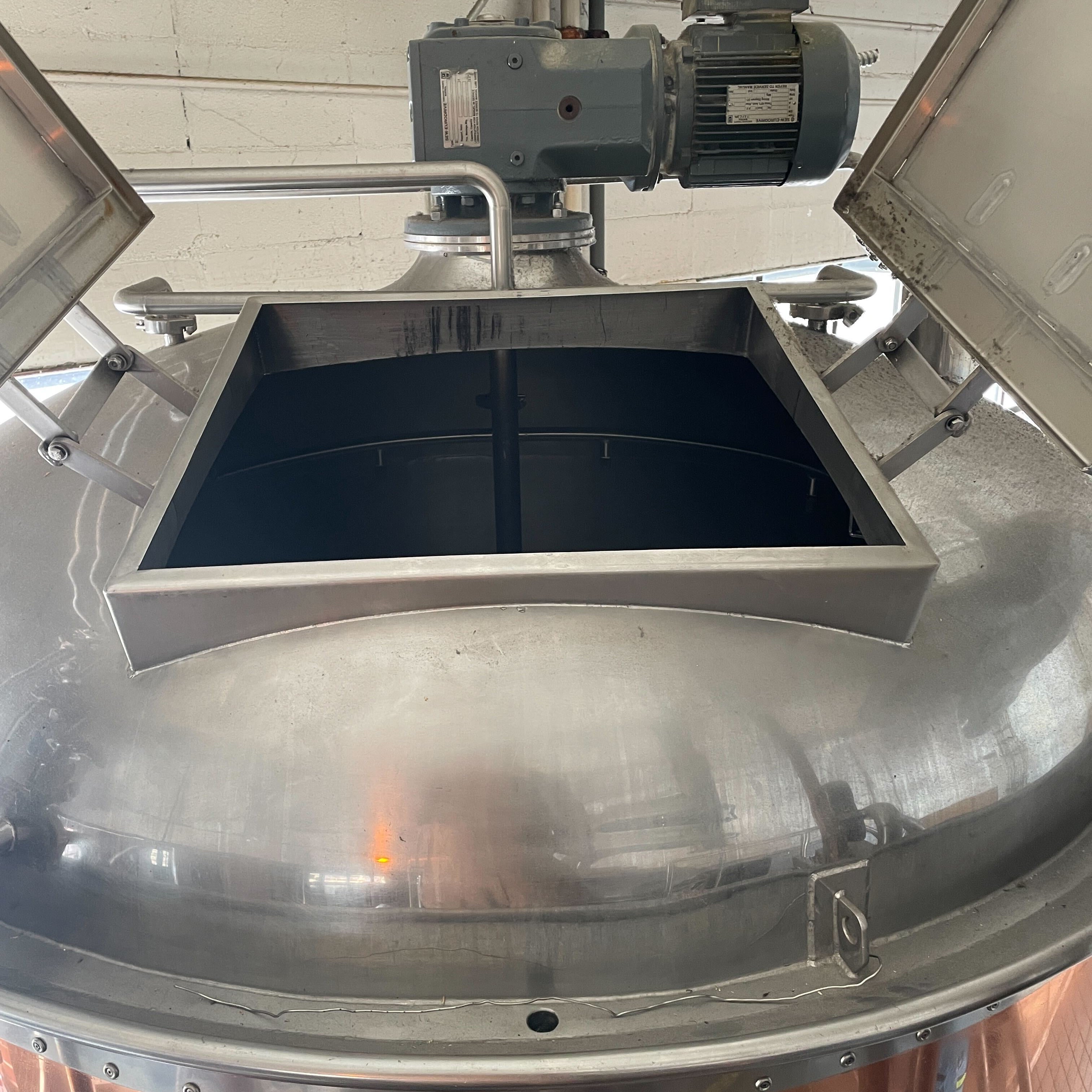 600 gallon steam fired mash tun with motorized rakes, wort grant, and sight