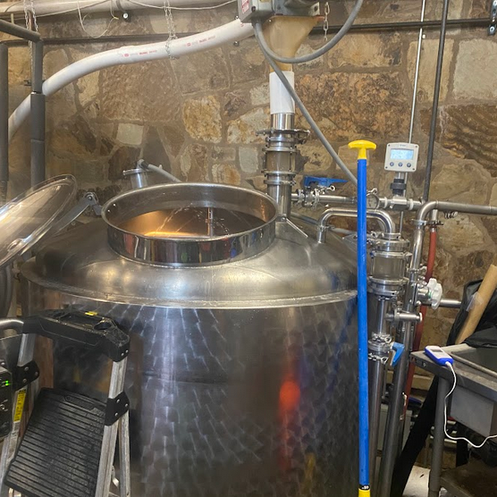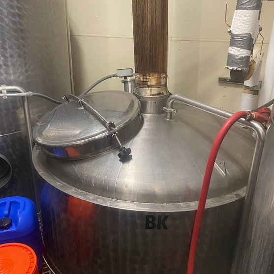 Kettle features 90° wort inlet & WP jet, removable trub dam, 8" vent w/ condensate drain, insulated and jacketed bottom, 23" manway