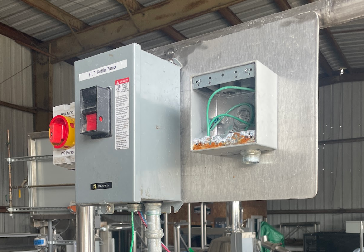 Three (3) brewhouse pumps total, flow meter, and VFD mounted to platform